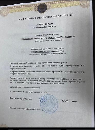 Предоставление финансовых услуг, включая привлечение денежных средств и выдачу кредитов. Деятельность осуществляется согласно лицензии №296 от 6 сентября 2001 года, выданной Национальным банком Кыр...