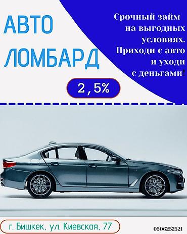 Ломбард под залог авто (с изъятием автомобиля) - Тариф: 2,5% в месяц - Минимальный срок договора: 30 дней - Лицензированный ломбард - Адрес: г. Бишкек, ул. Киевская, 77Е