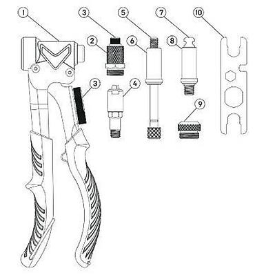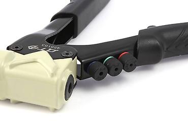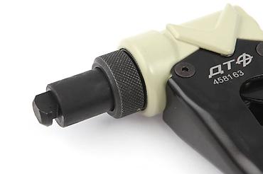 Универсальный заклёпочник, который за счёт сменных оснасток позволяет работать с двумя видами заклёпок, а также делать полукруглые и квадратные просечки в листовых материалах. Все необходимые насадки входят в комплект.