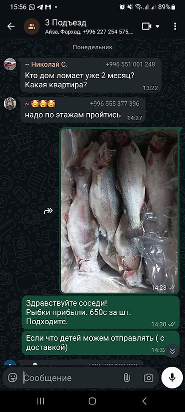 Свежемороженая радужная форель, вес рыбы от 0.9 до1.3кг находится в Бишкеке.Цена 500сом за кг. Оптом торг.Вход•Регистрация