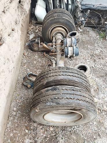 - Задняя/межосевая тележка прицепа: балка моста с колесами в сдвоенном исполнении, тормозные камеры, площадки крепления рессор/рычагов, элементы пневмоподвески (воздушные баллоны).