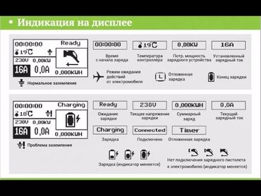 Встроенный экран отображает время зарядки, напряжение в сети, установленный ток зарядки, текущий ток зарядки, текущую потребляемую мощность, наличие заземления, статус зарядки и счетчик потребленной электроэнергии (Вт).