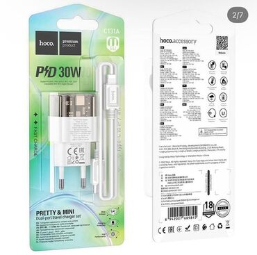 C131A Platinum, зарядное устройство с одним Type-C 30W и одним USB-A 18W выходами, EU штекер, набор с кабелем 1м Type-C на Lightning или Type-C на Type-C