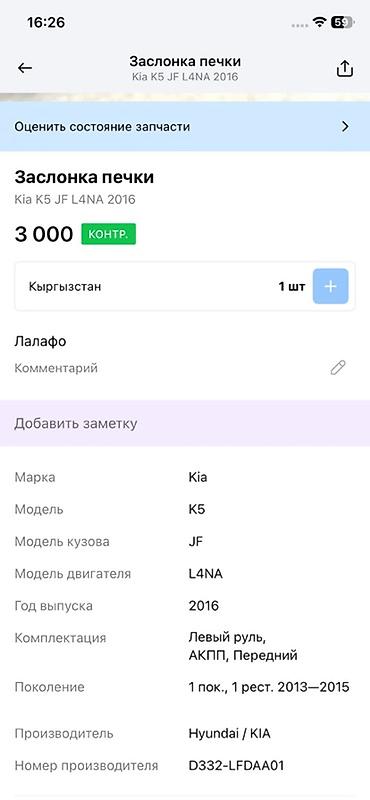 - Совместимость: Kia K5 (JF), 1-е поколение, рестайлинг 2013–2015, левый руль, АКПП, передний привод