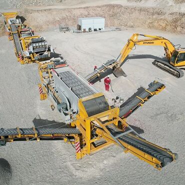 Мобильная дробильно-сортировочная установка на шасси 100 тонн в час Описание: - Комплекс на колесном полуприцепе с несколькими ленточными конвейерами, виброситами и узлом дробления. - Приемный бу...