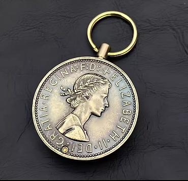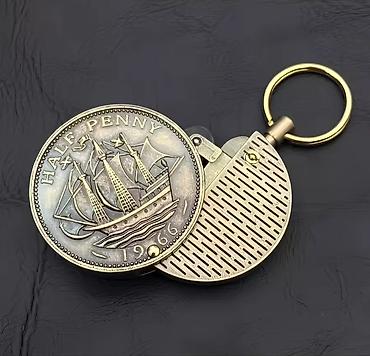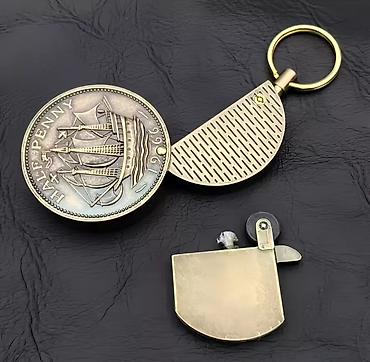 Зажигалка в виде монеты с изображением парусника и надписью "Half Penny 1966". На другой стороне зажигалки изображен профиль королевы Елизаветы II. Зажигалка имеет бронзовый оттенок