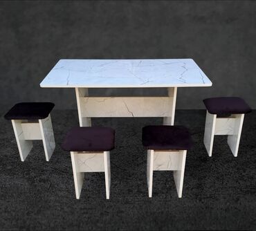 Обеденный комплект стол + табуреты - Комплект: прямоугольный стол и 4 табурета. - Материал: ЛДСП с имитацией камня/мрамора, кромки обработаны. - Столешница прямоугольная, устойчивая опора-тумба. -...