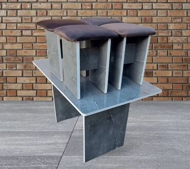 Комплект обеденного стола в современном стиле. Состав: - Обеденный стол с оригинальной геометрической опорой. - Четыре табурета с мягкими подушками сидений. Материалы и дизайн: - Столешница и опо...