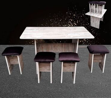 Обеденный комплект стол + табуреты - Комплект: прямоугольный стол и 4 табурета. - Материал: ЛДСП с имитацией камня/мрамора, кромки обработаны. - Столешница прямоугольная, устойчивая опора-тумба. -...