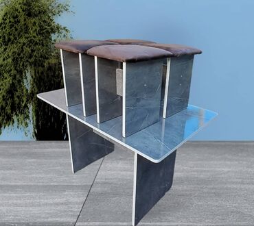 Комплект обеденного стола в современном стиле. Состав: - Обеденный стол с оригинальной геометрической опорой. - Четыре табурета с мягкими подушками сидений. Материалы и дизайн: - Столешница и опо...