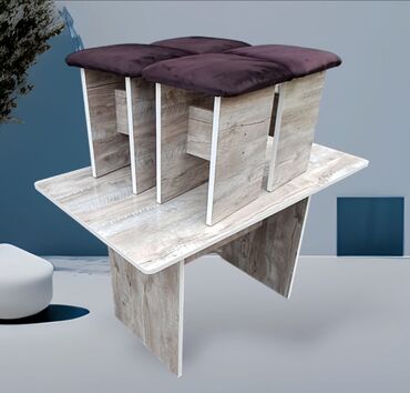 Многофункциональный стол-комод с мягкими сиденьями - Конструкция 2-в-1: нижняя часть — устойчивый стол/консоль из ЛДСП под текстуру светлого дерева; верхняя — четыре отдельные табурета со мягкими ...