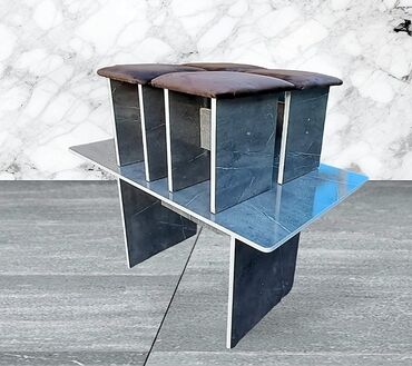 Дизайнерский комплект для зала: стол и два табурета/пуфа. - Материал: плиты под камень/керамогранит с мраморной текстурой, кромки со светлым кантом. - Конструкция: стол с крестовидной опорой и ква...