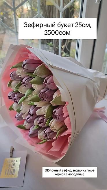 Пример: зефирный букет диаметром 25 см — 2500 сом (яблочный зефир и зефир из пюре черной смородины), как указано на фото.