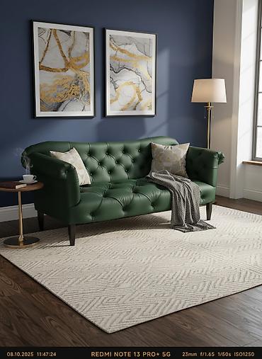 Зелёный трёхместный диван в современном минималистичном стиле. Характеристики: - Прямой корпус с узкими подлокотниками, визуально лёгкий силуэт - Три глубокие посадочные подушки и три объёмные мяг...