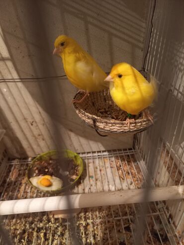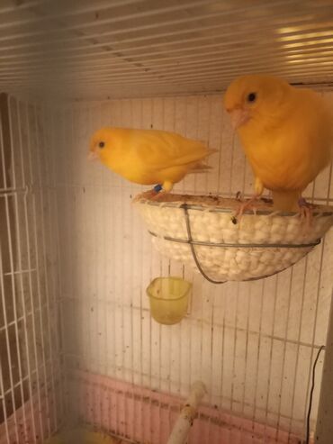 Канарейки жёлтого окраса в клетке