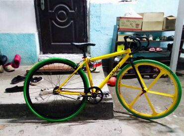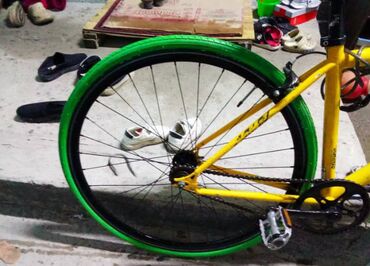 Фикс-байк (single speed). Алмашам лбой. и. нерсегеярко‑жёлтого цвета с контрастными зелёными покрышками. Алм