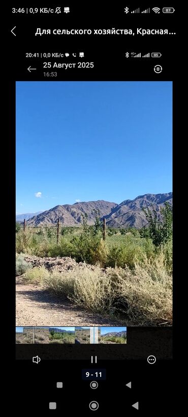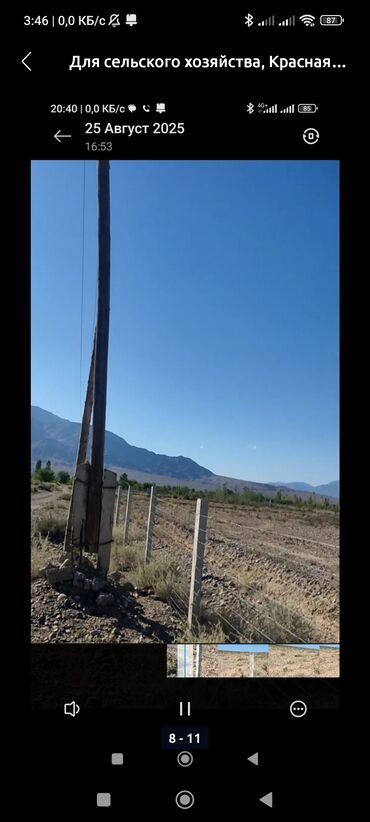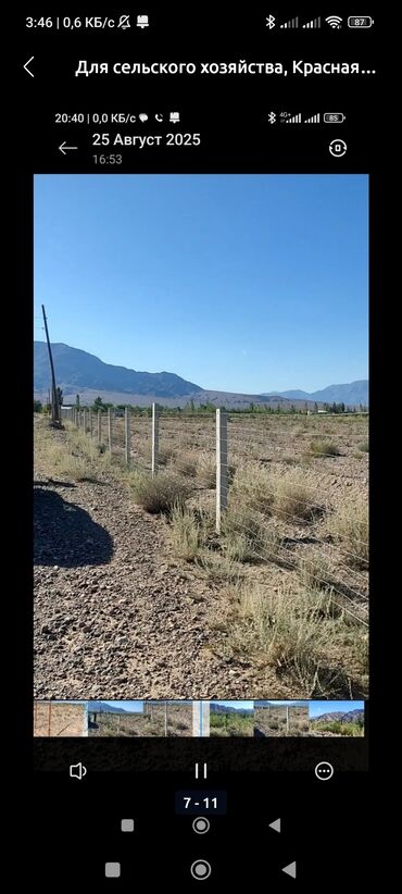 - Инфраструктура и особенности: участок ограждён металлической сеткой/проволочным забором на бетонных столбах; ровный рельеф, открытая местность с панорамным видом на горы, подъезд по грунтовой дороге, рядом проходит линия электропередачи.