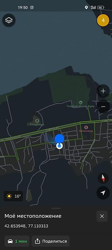 Продаётся земельный участок в Чолпон-Ате (координаты на карте: 42.653948, 77.110313). Назначение — индивидуальное жилищное строительство. Оформление: государственный акт о праве частной собственности на земельный участок.