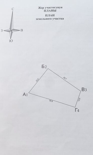 - Форма участка — многоугольник, стороны по замерам: 35,9 м, 12,5 м, 29,7 м, 23,5 м (схема прилагается).