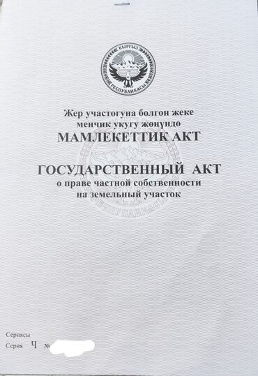 Земельный участок с оформленным Государственным актом о праве частной собственности (Кыргызская Республика). В наличии полный пакет землеустроительной документации: ситуационный план, план границ с размерами сторон, привязка участка, чертеж застройки.