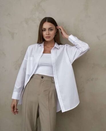 Белая рубашка-туника оверсайз - Классический отложной воротник - Полная застёжка на пуговицы спереди - Длинные рукава с манжетами на пуговицах - Свободный прямой крой, удлинённая длина до середины...