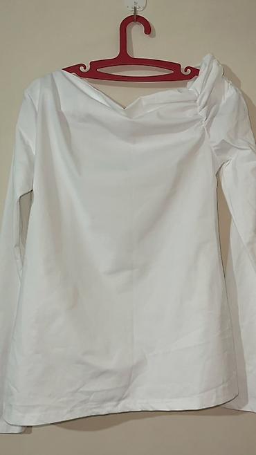 Белая женская блуза с длинным рукавом и драпировкой у выреза.