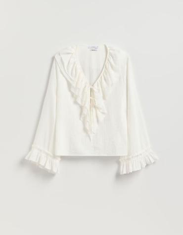 - Декор: многослойные воланы по линии воротника и на груди, оборки по низу длинных рукавов