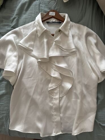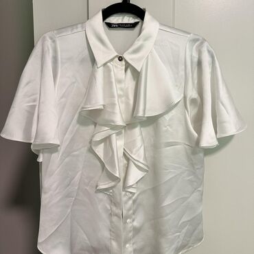 БелыйБлузка ZARA Woman, белая, с короткими рукавами-клеш и крупными каскадными воланами по центру. Классический отложной воротник, застёжка на пуговицы спереди (основная планка скрытая), верхняя декоративная пуговица под «кристалл». Лёгкая струящаяся ткань с мягким сатиновым блеском. Прямой силуэт, округлённый низ. Подходит для офиса и торжественных выходов — эффектные рюши создают акцент и хорошо сочетаются с юбками и брюками высокой посадки. На ярлыке — ZARA Woman.