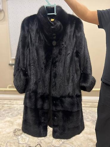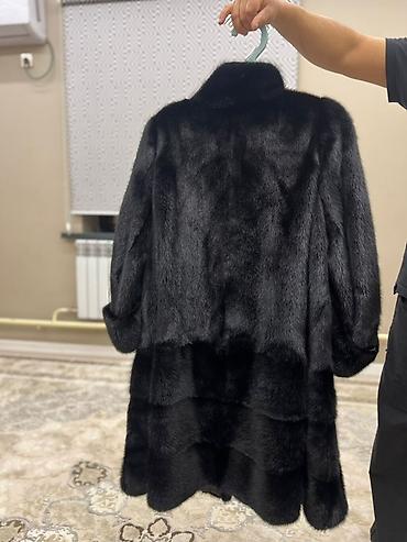 Шуба из натурального меха норки, цвет – глубокий чёрный. Классический прямой силуэт длины чуть ниже колена. Высокий воротник-стойка с застёжкой на крупные декоративные пуговицы; основной ряд – потайные крючки. Рукава 3/4 с мягкими отворотами. Низ и подол оформлены широкими горизонтальными полосами из меховых пластин, создающими объём и благородный перелив. Подкладка тёмная, гладкая. Лаконичный, элегантный дизайн, хорошо держит форму и смотрится богато как с вечерним образом, так и с повседневной одеждой.