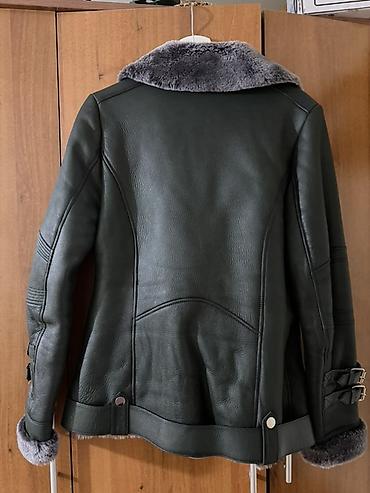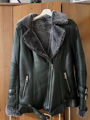 - Натуральная овчина: внешняя сторона — кожа с лёгкой фактурой, подклад — густой серый мех