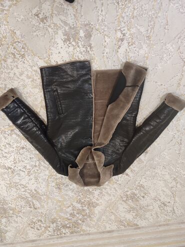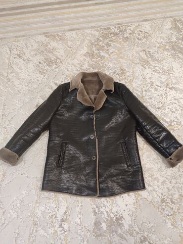 - Материалы: внешняя сторона — тиснённая кожа с эффектом рептилии; внутри — плотный мех овчины по всему изделию, включая рукава и воротник.