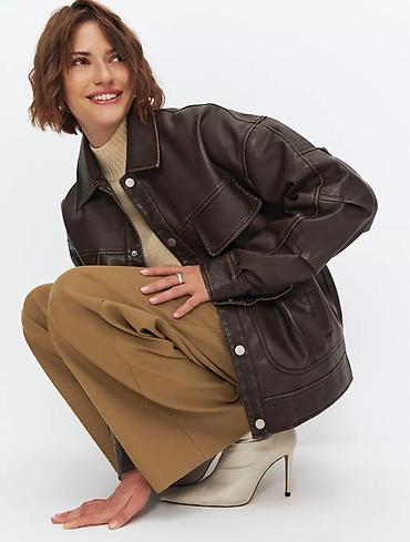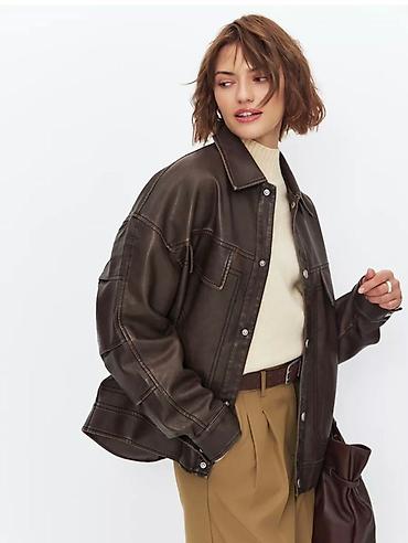 Куртка-жакет двусторонняя из эко‑кожи - Формат: свободный крой, круглый вырез горловины, без воротника и без застёжки спереди. - Материалы: одна сторона — мягкая эко‑кожа тёмно‑коричневого цвета; ...