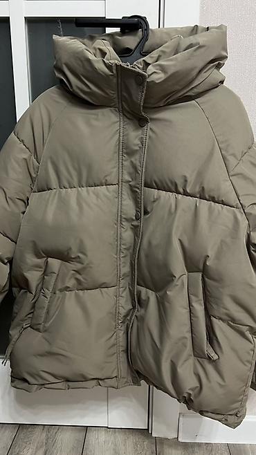 Объёмная зимняя куртка-пуховик, цвет — тёплый хаки/оливковый.