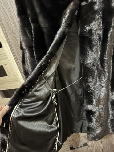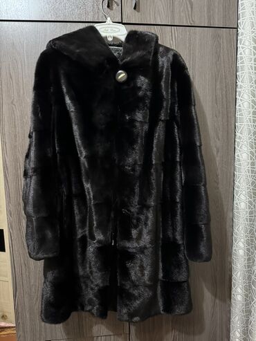 Шуба из натурального меха норки, цвет глубокий черный. Классический крой до колена с прямым силуэтом и длинным рукавом. Объемный капюшон, крупная декоративная пуговица у горловины и скрытая застежка на крючках по всей длине. Внутри — атласная подкладка, аккуратная отделка кантом; по талии расположена стяжка-шнурок для регулировки посадки. Боковые карманы. Фактура меха — блестящая, однородная, уложенные поперечные пластины. Универсальная модель для повседневных образов и выходов. Новая 2 раза одевались.