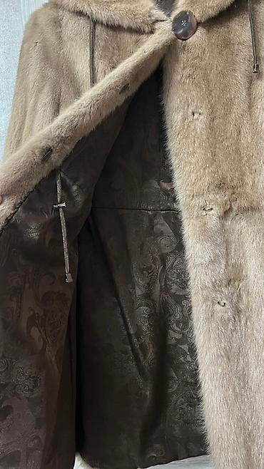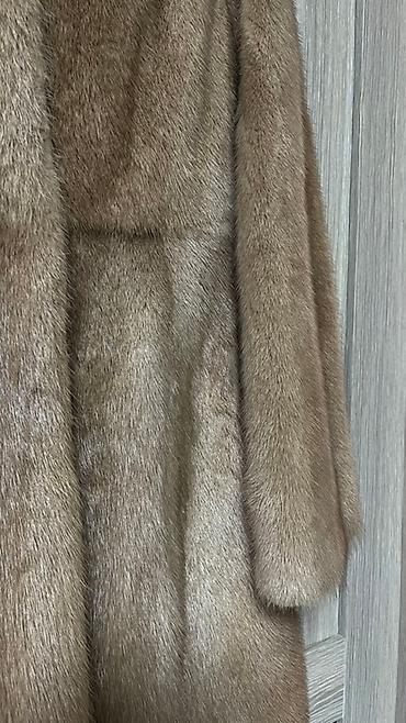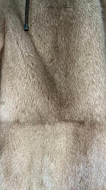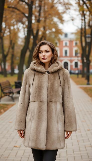 Шуба из норки с капюшоном, цвет — светло-ореховый/бежевый.