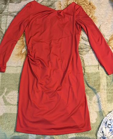 - Платье красное, длина до колена, длинный рукав. Эластичный материал, асимметричный вырез лодочка, мягкие сборки по линии талии и бедер для акцентирования силуэта. Размер 48, цена 400 сом