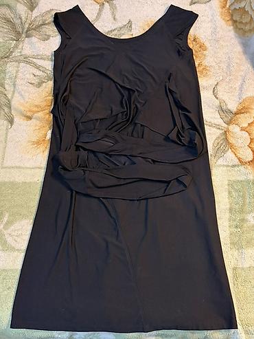- Платье черное, без рукавов, длина до колена. Плотный эластичный трикотаж, мягко драпируется по талии за счет асимметричных складок. Круглая горловина, силуэт полуприлегающий. Размер 50-52. Цена 400 сом
