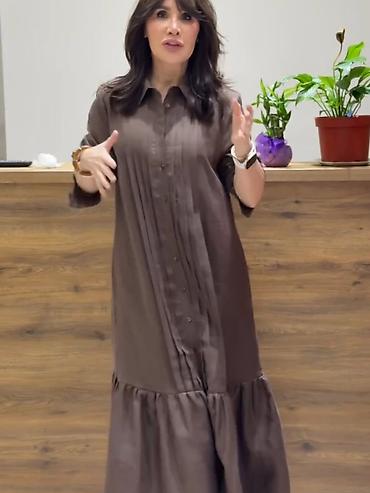 4) Платье рубашечного кроя шоколадного оттенка: отложной воротник, центральная застежка на пуговицы, вертикальные защипы по планке. Низ — многоярусная широкая оборка, свободный прямой силуэт, длина миди. Натуральная на ощупь ткань с мягким блеском.