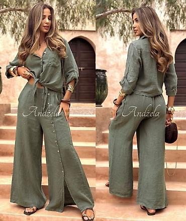 1) Комплект из легкой ткани: свободная рубашка на пуговицах с рукавами до локтя (можно подворачивать) и широкие брюки-палаццо на поясе с кулиской. По боковой линии брюк — декоративная планка с пуговицами и разрез. Натуральная дышащая фактура, мягкая посадка, универсальный оливково‑хаки цвет.