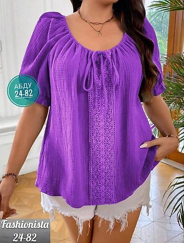 2) Блуза из крэш-ткани ярко-фиолетового оттенка: круглая горловина на кулиске со шнурком, короткий рукав с легкой сборкой. В центре — вертикальная декоративная вставка с ажурным узором. Свободный силуэт, комфортная длина до бедра. На изображении указаны размеры: АБДУ 24–82 / Fashionista 24–82.