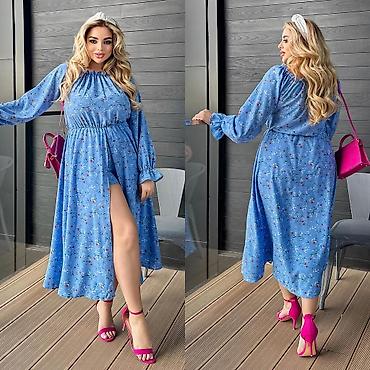 3) Платье миди из легкой струящейся ткани небесно‑голубого цвета с мелким цветочным принтом. Горловина со сборкой, длинный рукав на резинке, талия подчеркнута эластичной кулиской. Юбка со смещенным разрезом спереди, свободный расклешенный низ.