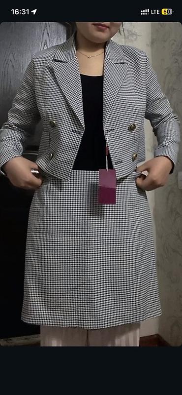 - Классический чёрно‑белый принт, плотная костюмная ткань
