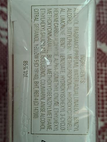 - Состав (основные ингредиенты на коробке): Alcohol, Fragrance (Parfum), Aqua, Linalool, Benzyl Alcohol, Butylphenyl Methylpropional, Hydroxycitronellal, Limonene, Benzyl Benzoate, Hydroxyisohexyl 3-Cyclohexene Carboxaldehyde, Alpha-Isomethyl Ionone, Ethylhexyl Methoxycinnamate, Butyl Methoxydibenzoylmethane, Ethylhexyl Salicylate, Isoeugenol, Coumarin, Anise Alcohol, Citral, Geraniol, BHT, красители Yellow 5 (CI 19140), Red 4 (CI 14700).