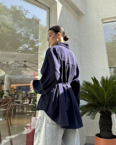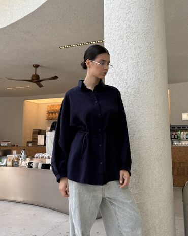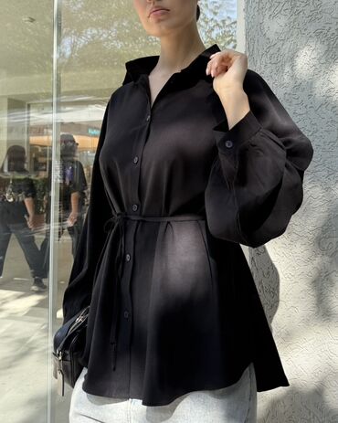 Рубашка женская с поясом-стрингом на талии. - Силуэт: свободный верх