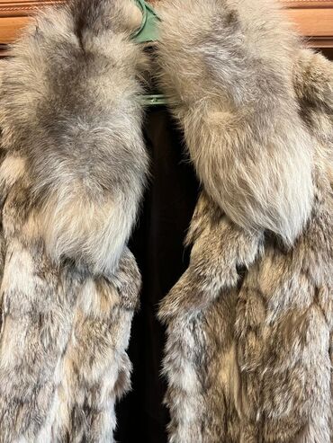 Шуба из меха собаки природного серо-бежевого меха с фактурным