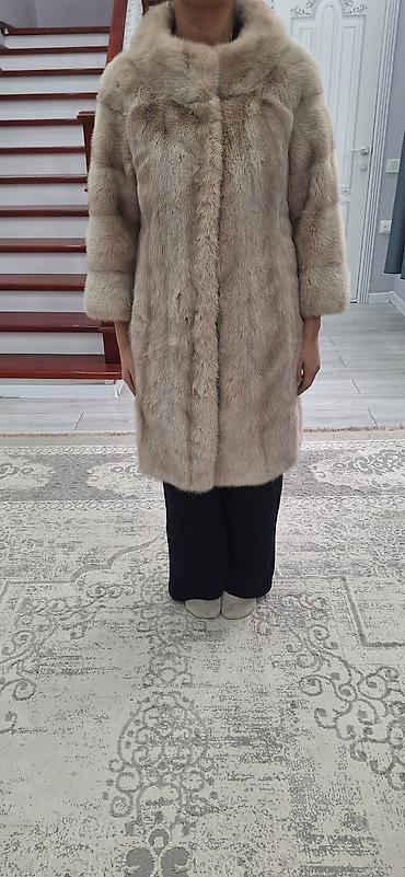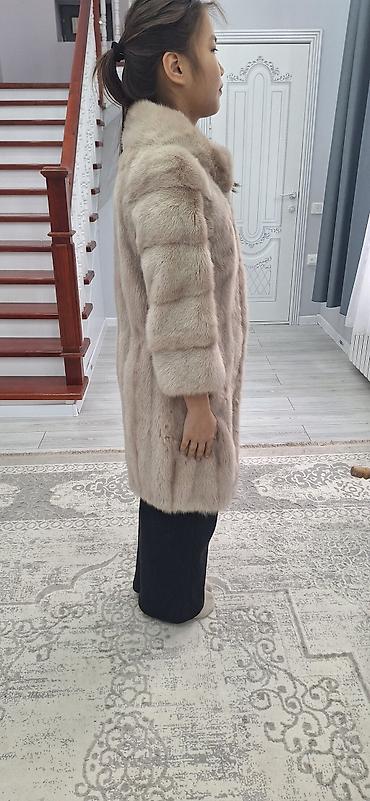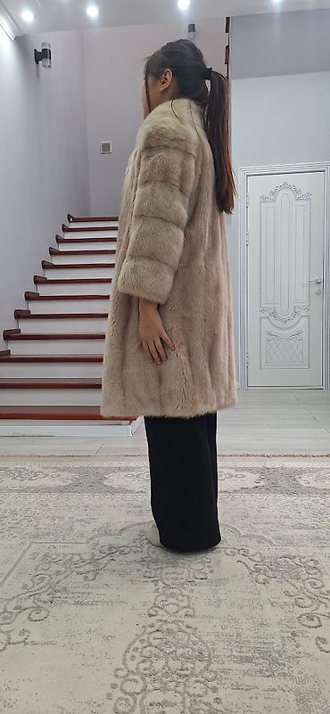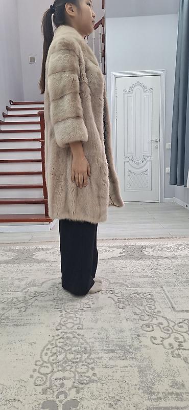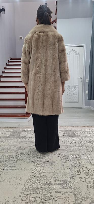 Шуба из натурального меха, длина миди. Цвет — благородный беж/пудровый. Прямой силуэт с мягкой посадкой, без выраженной талии. Объемный воротник-стойка создает аккуратную линию плеч. Рукав 3/4 с поперечной раскладкой меха, визуально придает шика и облегчает образ. Застежка — скрытая центральная (крючки/кнопки под планкой).