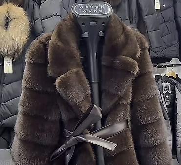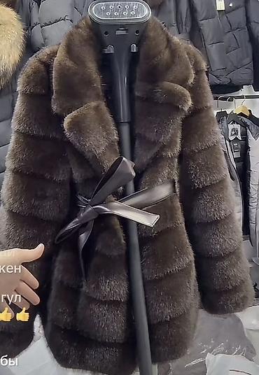Шуба из темно-коричневого меха с поперечными полосами. Классический силуэт до середины бедра, объемный английский воротник-апаш. Застежка – пояс из гладкой эко-кожи, завязывается на бант/узел, подчеркивая талию. Втачные длинные рукава, боковые прорезные карманы. Мягкий густой мех с равномерным блеском, аккуратные горизонтальные швы создают фактурный «поярусный» эффект. Универсальная модель для холодного сезона: хорошо сочетается с платьями и джинсами, подходит для повседневной носки и выхода. Цвет: глубокий шоколад.