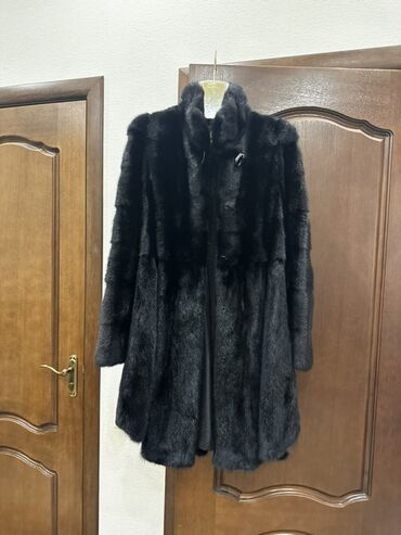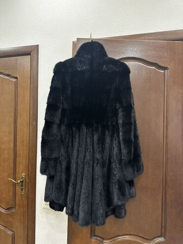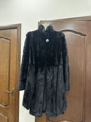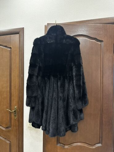 Шуба из натурального меха (– норка), насыщенный чёрный цвет с лёгким градиентом. Классический силуэт до колена, расширение к низу за счёт клиньев, создаёт мягкую «а‑с» линию.