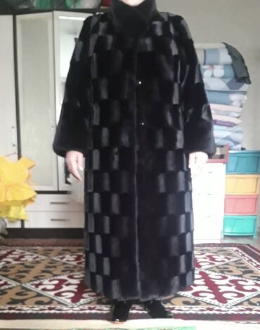Длинная женская шуба из темного меха с выразительным геометрическим узором «плитка».