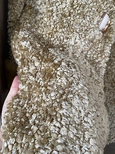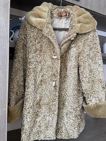 - Материал: каракуль (кудрявый ворс с благородным блеском), отложной воротник и широкие отвороты рукавов из гладкого меха в тон.